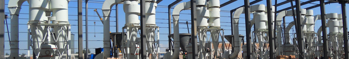 大塊物料經顎式破碎機破碎到所需粒度后,由提升機送至儲料斗,再由皮帶機將物料均勻定量連續地送入6臺MTW175歐版磨的主機磨室內進行研磨。粉磨后的物料被風機氣流送入選粉機進行分級,在選粉機葉輪的作用下,不符合細度要求的物料落入磨室內重新碾磨,合格的物料則經空氣斜槽進入旋風集粉器內,進行分離收集,經排料裝置排出即為成品粉體。