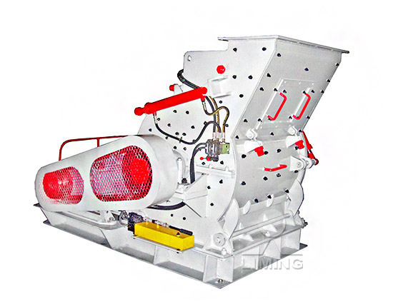 主機通過電機、三角皮帶帶動主軸,從而使轉(zhuǎn)子旋轉(zhuǎn),錘頭受到旋轉(zhuǎn)時所產(chǎn)生的離心力向四周伸開,大塊物料從進(jìn)料口進(jìn)入破碎腔之后,便被高速運動的錘子擊碎。破碎合格的物料則由下部有縫隙的蓖條排出,不合格的則留在破碎腔內(nèi),被錘子和承擊鐵塊反復(fù)作用,直至能夠合格排出。為避免堵塞,被粉碎物料的含水量一般不超過5% 。